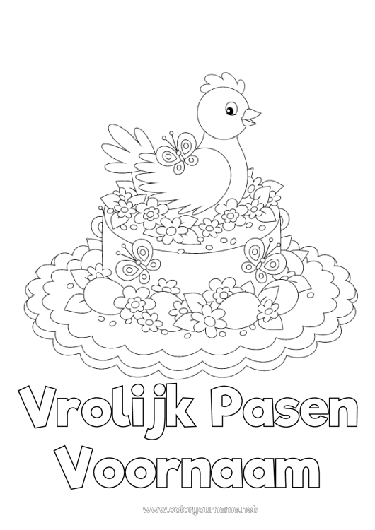 Deze gratis kleurplaat viert Pasen met een vrolijke kip, zittend op wat een versierde taart of een paashoed kan zijn. Omringd door bloemen, vlinders en paaseieren, voegt deze tekening een vrolijke lentesfeer toe. De tekst "Vrolijk Pasen" maakt de illustratie compleet.