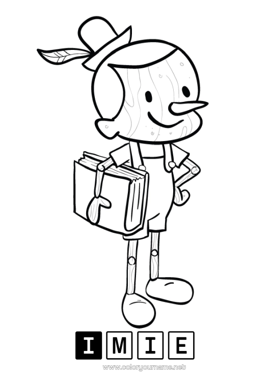 Kolorowanka drewnianego pajacyka Pinokia, który trzyma książkę. Widać ślady drewna. Pinokio nosi kapelusz. Jego nos wydłuża się, gdy kłamie. Kolorowanka z bajki do personalizacji z wybranym przez Ciebie przesłaniem, takim jak "Dawno, dawno temu" lub po prostu imieniem.