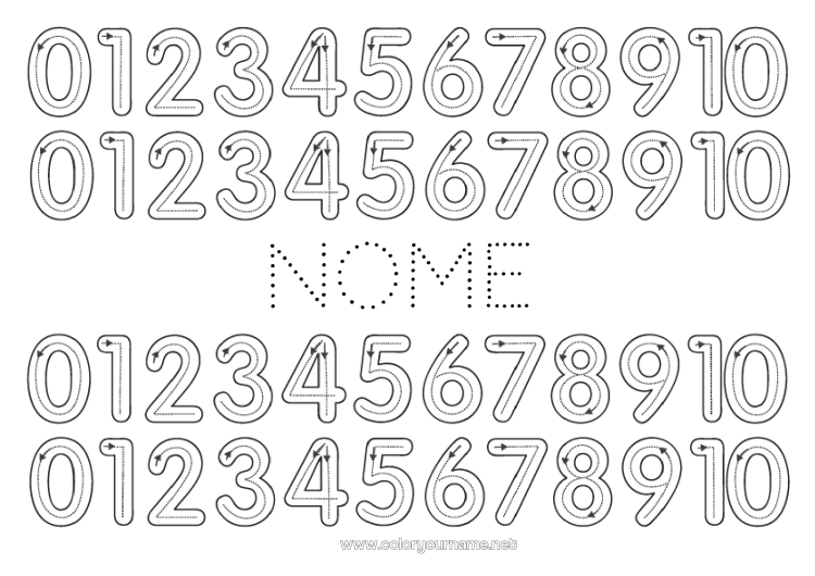 Esta ficha gratuita para imprimir permite que as crianças aprendam a traçar os números de 0 a 10 seguindo as setas e os tracejados. Cada número é apresentado várias vezes para facilitar a prática. O nome da criança pode ser personalizado no centro da página para tornar a atividade ainda mais motivadora.