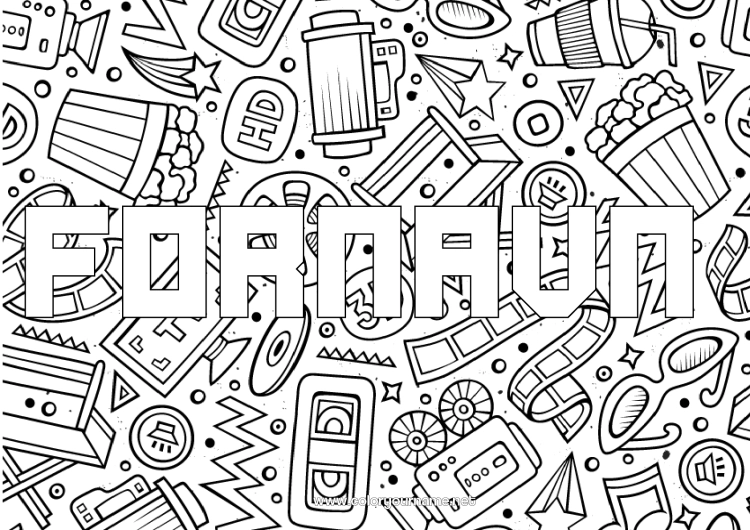 Gratis farvelægning: Indtast et navn, ord eller besked efter eget valg på baggrund af symboler fra tv og film. På farvelægningsbilledet finder du filmruller, en stjerne-stol, en stjerne, popcorn, en projektor, 3D-briller, popcorn, en sodavand osv. Tilpas farvelægningen med en kort besked som "Netflix-aften", "tv-serie", "en film i aften", "biograf" eller blot et navn, før du printer det.