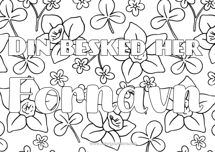 Denne gratis farvelægning bringer dig ind i en forårsagtig stemning med en baggrund bestående af delikate påskeliljer i blomst, heldige kløver og små vilde blomster. Perfekt til at fejre forårets ankomst, er denne farvelægning helt tilpasselig: tilføj en kort besked og det navn, du ønsker.