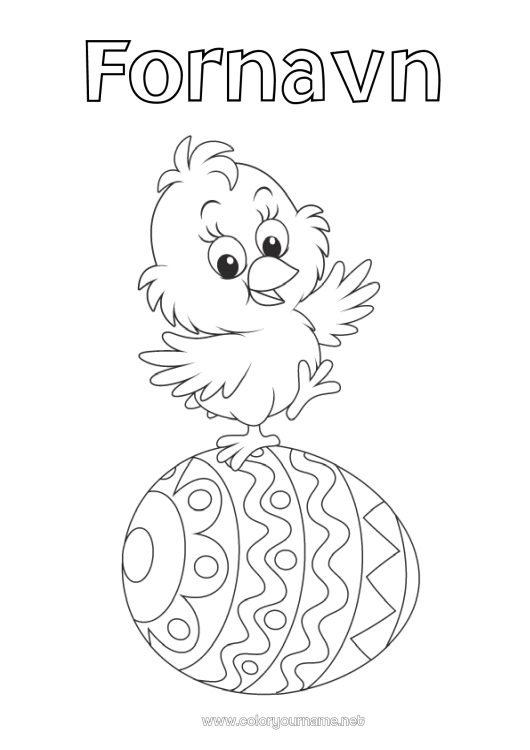 Forårsfarvning med en kylling, der balancerer på et stort dekoreret påskeæg, som kan tilpasses med en besked eller et navn, før det printes.