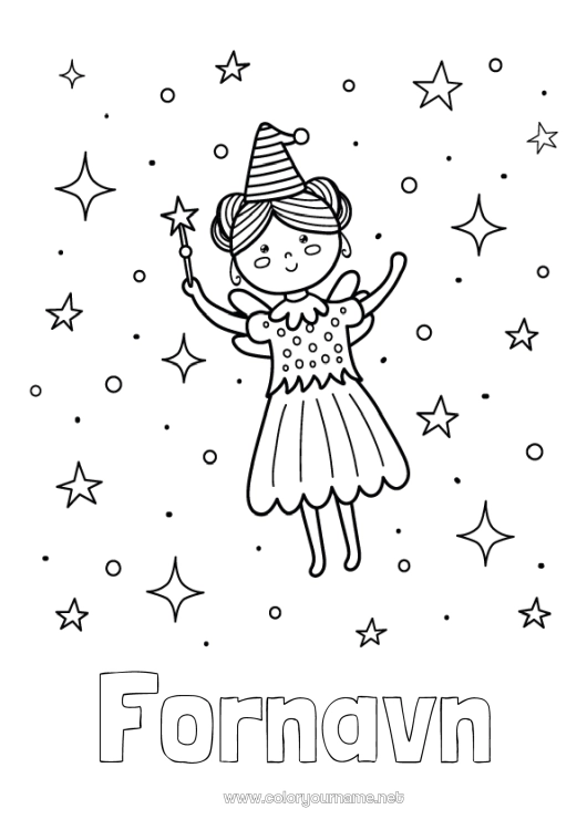 Farvelægning med temaet Tandfeen, med en lille fe og hendes tryllestav blandt stjernerne. Kan tilpasses med et navn.