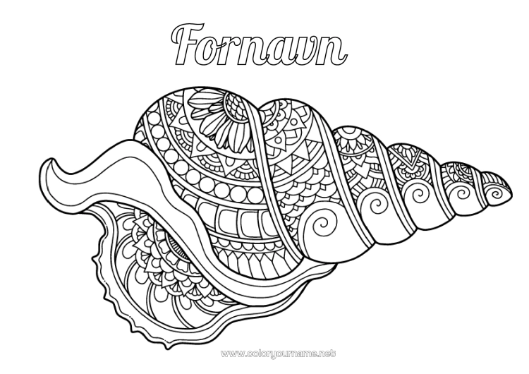 Gratis farvelægning af en muslingeskal i mandala-stil. Tegning til farvelægning af muslingeskal, som kan tilpasses med en kort besked som "leve havet", "god ferie", "lad os slappe af" eller blot et navn, før den printes.