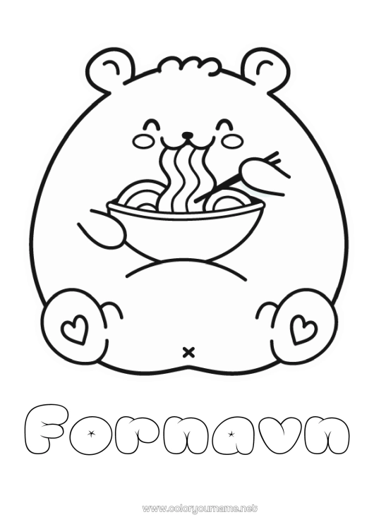 Denne gratis farvelægningsside viser en yndig lille bjørn, der nyder en skål ramen. Bjørnen holder på spisepinde og ser virkelig ud til at værdsætte sit måltid. Dens små runde ører og poter dekoreret med hjerter tilføjer et sødt og charmerende præg til illustrationen. Nederst på billedet står ordet "Navn" skrevet med store, runde bogstaver, så man kan tilpasse siden med barnets navn eller en sjov besked.