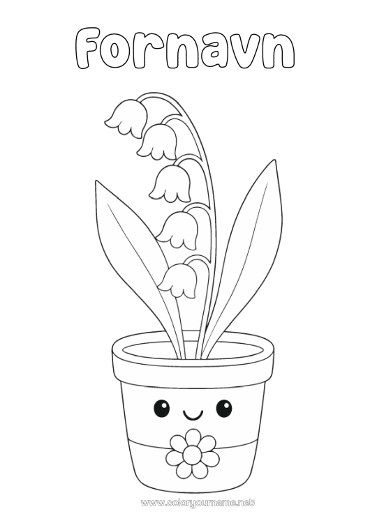 Denne gratis farvelægning viser en yndig blomsterkrukke med en gren af liljekonvaller med små klokkeformede blomster. Med sine to store blade og sin krukke dekoreret med en smilende blomst, er denne forårsscene perfekt til at fejre 1. maj eller til at give som en farverig tegning. Barnets navn kan tilføjes direkte på siden for at skabe en unik farvelægning før udskrivning. En ideel aktivitet til foråret, som kan downloades gratis!