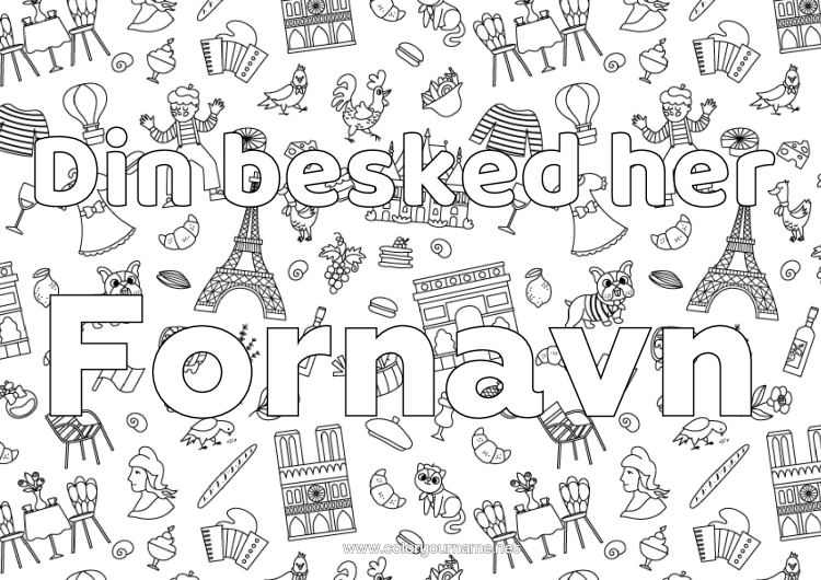 Denne gratis farvelægning samler de ikoniske symboler fra Paris og den franske kultur: Eiffeltårnet, Triumfbuen, Notre-Dame, croissanter, baguetter, oste, haner og mange andre charmerende detaljer. Hvert barn kan tilpasse denne illustrerede baggrund ved at tilføje sit navn, før den printes. En ideel aktivitet til at opdage Paris, mens man farvelægger kreativt! Gratis download for en unik oplevelse omkring Frankrig.