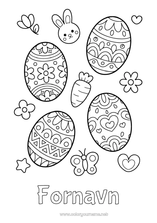 Malebog med flere påskeæg prydet med forskellige mønstre: blomster, hjerter, linjer og geometriske former. Rundt om æggene findes en kanin, en gulerod, blomster, en stjerne, et hjerte og en sommerfugl, der vækker foråret til live. Tegningerne har en sød kawaii-stil til børn.