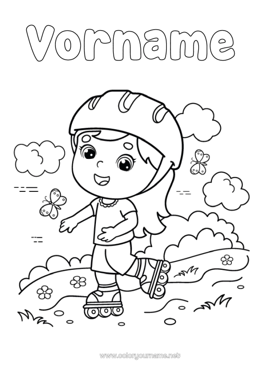 Diese kostenlose Malvorlage zeigt ein lächelndes Mädchen, das draußen Rollschuh fährt, umgeben von Wolken, Schmetterlingen und Blumen. Sie trägt einen Schutzhelm, was die Bedeutung von Sicherheit beim Spielen unterstreicht. Der Name des Kindes kann oben auf der Seite hinzugefügt werden, um sie vor dem Drucken zu personalisieren.