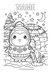 Coloring page little penguin with gifts under the snow