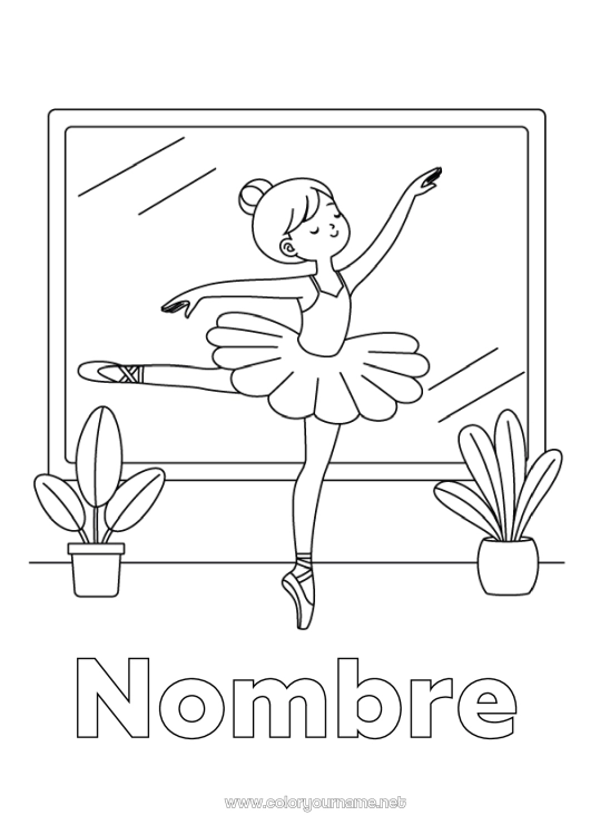 Esta página para colorear gratuita representa a una joven bailarina clásica en pleno movimiento frente a un espejo, vestida de ballet y en puntas. Dos plantas en macetas decoran la escena para crear un ambiente de estudio de danza. En la parte inferior, la palabra "Nombre" se puede personalizar con el nombre del niño, directamente en el sitio antes de imprimir.