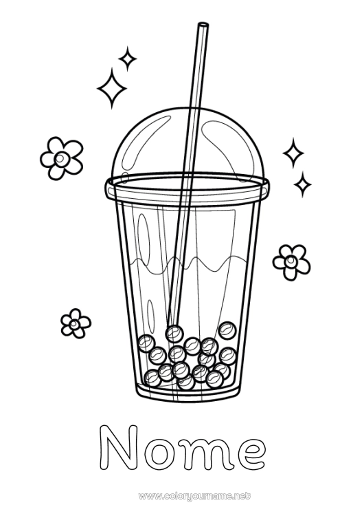 Questo disegno da colorare gratuito rappresenta un bicchiere di bubble tea (o boba tea), questa bevanda golosa e alla moda proveniente dall'Asia, piena di perle di tapioca. Circondato da fiori e stelle scintillanti, questo bubble tea kawaii farà innamorare gli amanti delle bevande originali!