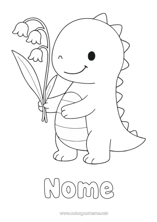 Questo disegno da colorare gratuito da stampare rappresenta un piccolo dinosauro che tiene un rametto di mughetto, simbolo del 1° maggio. Ideale per un'attività creativa primaverile, questo semplice disegno è perfetto per i bambini. Il nome del bambino può essere aggiunto direttamente sulla pagina prima della stampa, per un colorato unico e personalizzato. Perfetto per abbinare la scoperta del mughetto a un momento di relax.