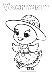 Kleurplaat met lente dieren en objecten. In het midden zijn er twee schattige konijnen die tekenen en schilderen. Om hen heen spelen verschillende kuikens met eieren. Een van de kuikens heeft een eierschaal op zijn hoofd. Een tafelkleed ligt op de grond, misschien voor een picknick. De lentekleurplaat kan worden gepersonaliseerd met een kort bericht of een naam voordat deze wordt afgedrukt.