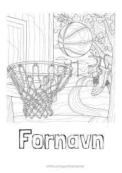 Dette gratis fargeleggingsarket viser en basketball som går i kurven, med en detaljert bakgrunn av banen. En banner øverst gir mulighet for å legge til et navn, og et område nederst kan tilpasses med en inspirerende melding. Ideelt for basketballfans og unge idrettsutøvere, er dette fargeleggingsarket perfekt for en morsom og motiverende aktivitet. Kan skrives ut gratis.