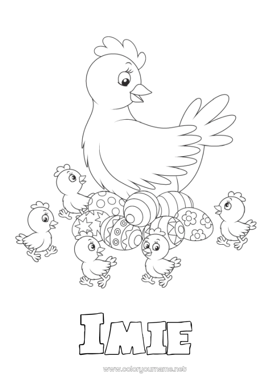 Wiosenne kolorowanka, kura na pisankach z wzorami. Mama kura z małymi kurczaczkami i pisankami do personalizacji z imieniem lub dowolnym przesłaniem: "Wesołych Świąt!" lub "To wiosna" na przykład.