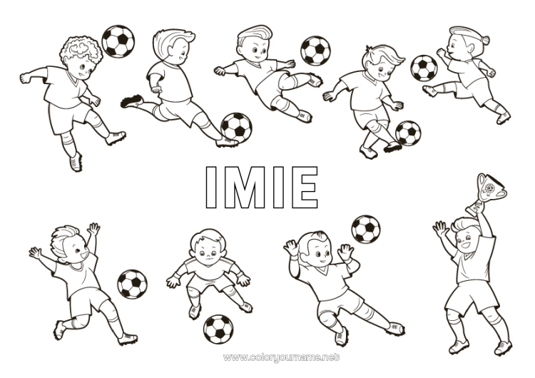 Ta strona do kolorowania do wydruku przedstawia piłkarzy wykonujących ćwiczenia z piłką nożną. Ciężko trenują, aby stać się lepszymi. Jeden z nich trzyma nawet puchar, być może dlatego, że są mistrzami swojej drużyny!