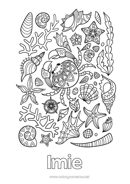 Na tej stronie z darmowym do wydrukowania kolorowanką odkryj kraba wśród wspaniałego morskiego uniwersum! Krab otoczony jest licznymi muszlami w różnych kształtach, a wodorosty delikatnie unoszą się wokół niego.