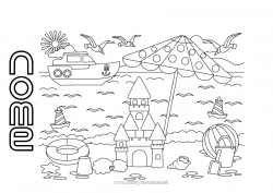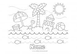 Colorir férias de verão na praia: castelo de areia, peixes, balde
