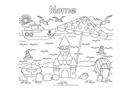 Coloração de praia no verão: castelo de areia, conchas, guarda-sol