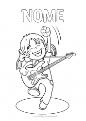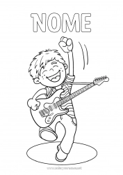 Desenho para colorir de uma criança tocando guitarra em uma partitura de notas musicais