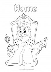 Bem-vindo à nossa página de desenhos grátis de reis! Aqui você encontrará desenhos de reis para imprimir e colorir para o prazer de crianças e adultos. Os reis costumavam ser figuras importantes na história, simbolizando poder, riqueza e luxo. Geralmente coroados, usavam roupas suntuosas, como casacos de pele, joias e cetros. Hoje, ainda existem reis em alguns países (Reino Unido, Espanha, Suécia, Noruega, Dinamarca, Holanda, Japão, Tailândia, Butão, Marrocos, etc.), mas seu papel é muitas vezes principalmente simbólico. Esses desenhos de reis permitirão que você explore o universo dos soberanos, seus séquitos, trajes e símbolos associados à realeza. Você pode personalizar cada desenho com uma mensagem curta, como "Viva o rei Charles!", "O rei da festa", "Majestade Felipe", "Reinado eterno", "Viva a coroa" ou ainda "Sob o signo da realeza". Imprima gratuitamente esses desenhos de reis, coroas e castelos. Divirta-se e solte sua criatividade no fascinante universo da realeza!