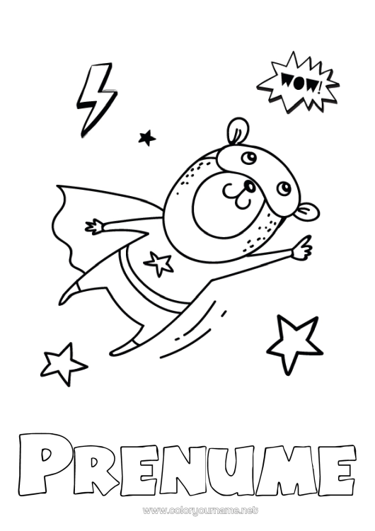 Colorare cu numele personalizat, cu un urs supererou zburând printre stele.