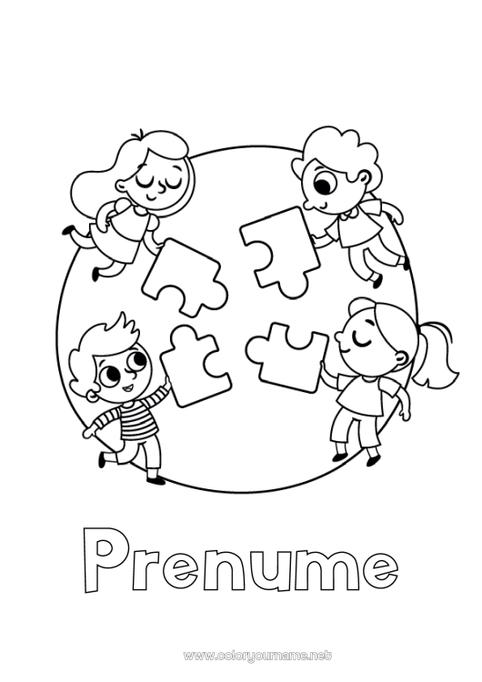 Această pagină de colorat gratuită de imprimat prezintă patru copii stând în jurul unui cerc care simbolizează Pământul. Fiecare dintre acești copii ține o piesă unică de puzzle. Asamblându-le, aceste patru piese formează un puzzle complet al Pământului.