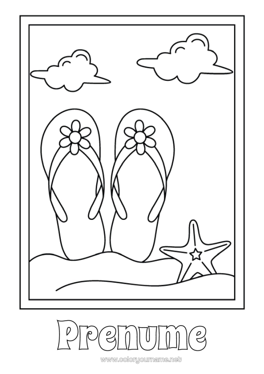 Colorare gratuit de sandale, papuci de plajă pentru copii. Încălțămintea se află pe plajă, înconjurată de o stea de mare. Desen de colorat simplu și ușor pentru copii de la grădiniță, de personalizat cu un mesaj scurt precum "vacanțe plăcute!", "trăiască plaja", "e timpul să ne relaxăm" sau pur și simplu un nume înainte de a fi imprimat.