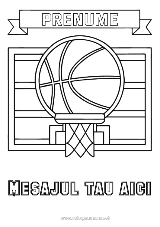 Această pagină de colorat gratuită reprezintă o minge de baschet care intră într-un coș, cu un fundal detaliat al terenului. Un banner în partea de sus permite adăugarea unui nume, iar un spațiu în partea de jos poate fi personalizat cu un mesaj inspirațional. Ideal pentru fanii baschetului și tinerii sportivi, această pagină de colorat este perfectă pentru o activitate distractivă și motivantă. Poate fi imprimată gratuit.