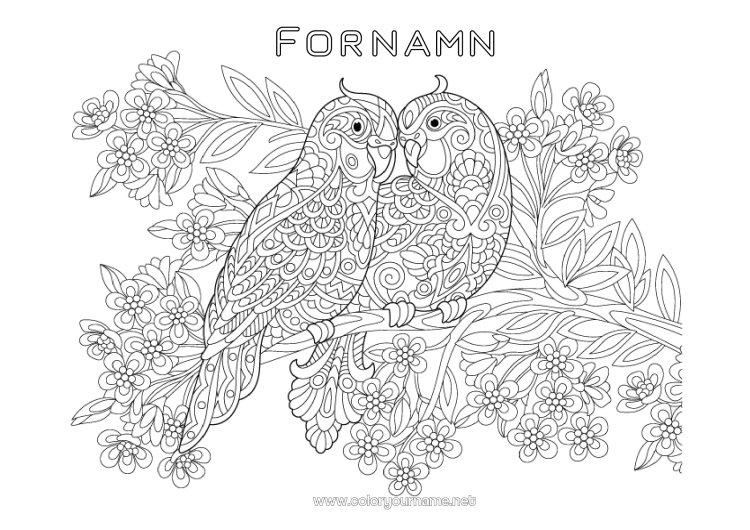 Färgläggning av papegojor, ara, kakaduor, sommarfåglar att anpassa med ett namn eller ett meddelande som "jag älskar dig" eller "oskiljaktiga". Två papegojor på en trädgren, kärlek, alla hjärtans dag, mandala. Teckning att färglägga för vuxna, lugn och zen med små mönster.