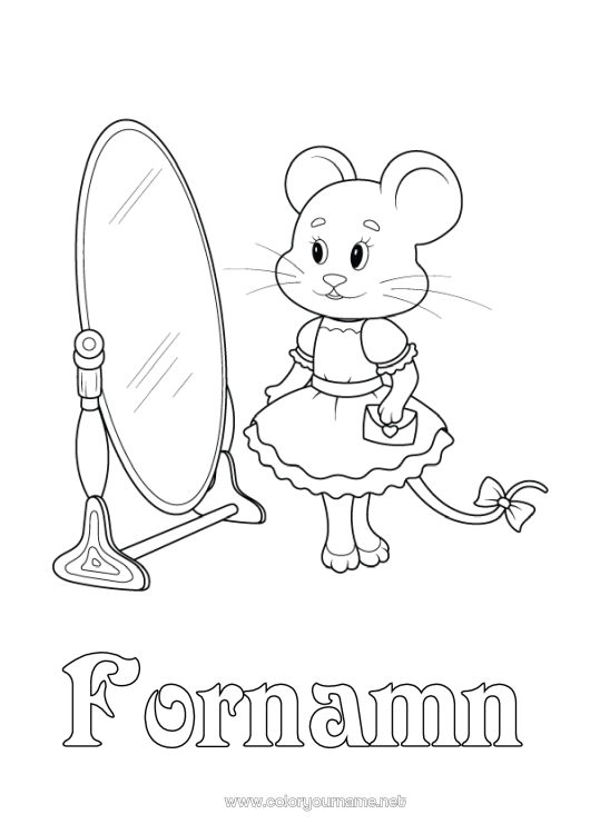 Gratis färgläggning av en söt liten mus som bär en fin klänning och tittar på sig själv i en stor golvstående spegel.