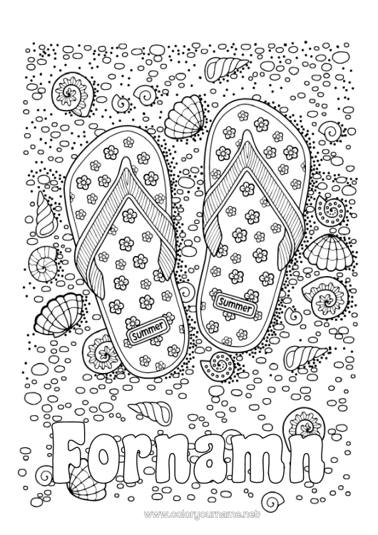 Gratis målarbok för vuxna: flip-flops på stranden. Många detaljer av små stenar och snäckor. Texten "sommar" på sandalerna. Målarbok att skriva ut för sommaren eller semestern. Anpassa målarboken med ett meddelande som "trevlig semester", "chilla och slappna av" eller helt enkelt ett namn för att ge bort som present.