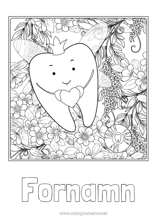 Anpassningsbar färgläggning med ett namn på temat Tandfé. Mjölktand med en krona, fevingar och ett hjärta i händerna. Blomsterdekoration i bakgrunden och texten "Tandfé-dag".