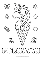 Söt målarbok med en liten söt enhörning på en regnbåge bland molnen, enhörningen håller en hjärtformad låda. Färglägg och anpassa din teckning för att säga "jag älskar dig" till din mamma eller den person du väljer.