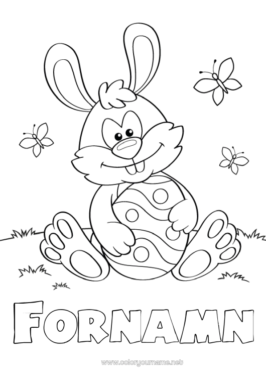 Färgläggning med vårtema, påskhare som sitter med ett stort påskägg mellan frambenen och tre fjärilar som flyger. Kan anpassas med ett namn eller ett litet meddelande som "Glad Påsk" eller "Leve våren"...